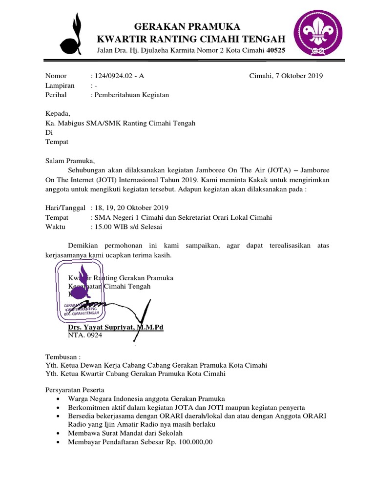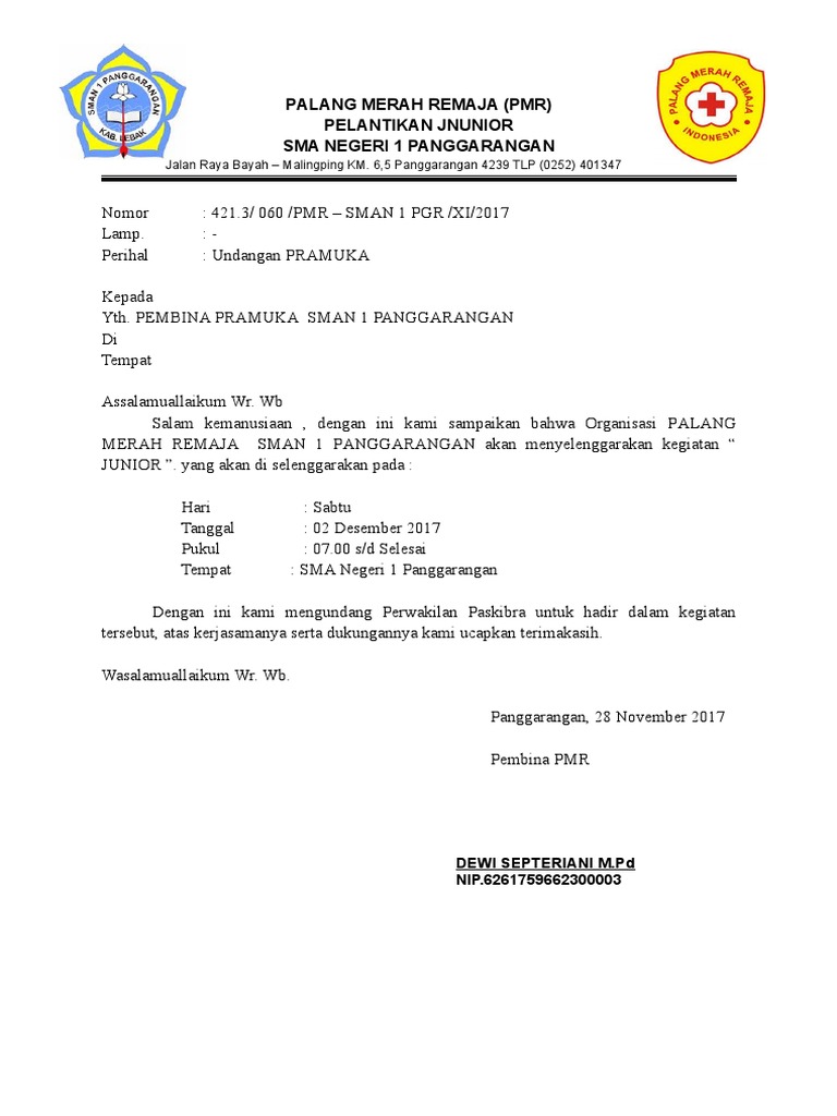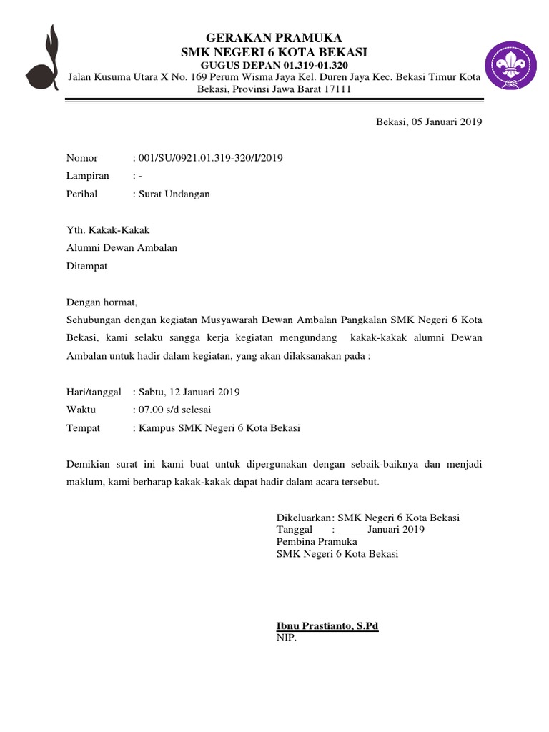 Gerkan pramuka saka bhayangkara anton soedjarwo. Apa yang dimaksud dengan surat undangan? Selanjutnya akan diberikan contoh surat undangan resmi organisasi pramuka sebagai berikut. Nah, surat resmi biasa digunakan untuk tujuan acara yang resmi, sedangkan. Contoh soal lctp pramuka penegak soal ini dibuat dalam gttt 2013 racana ki/nyi ahmad dahlan ums.