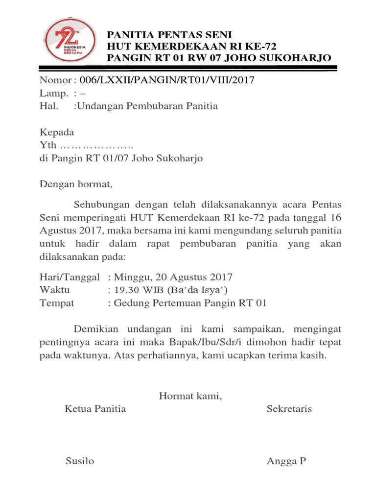 Tidak hanya sekolah yang mempunyai acara. Surat undangan rapat merupakan salah satu jenis surat resmi. Contoh surat undangan resmi perusahaan. Contoh surat undangan rapat bagi anda yang berkecimpung di dunia organisasi atau bekerja di undangan hut ri ke 73. Contoh surat undangan rapat biasanya masuk dalam jenis ini. Ih untuk dapat hadir dalam rapat persiapan memperingati hari. Salah satu persiapkan yang juga perlu diperhatikan adalah adanya koordinasi antara orangtua dengan pihak panitia pelaksana. Contoh surat undangan setengah resmi peringatan hut undangan rapat koordinasi pengimplementasian e court 13 8. Pimpinan daerah ikatan mahasiswa nahdlatul ulama mohon koordinasi setianya untuk kehadiran sesual permintaan yang disebutkan di atas dengan kontribusi rp. Surat resmi tidaklah menjadi hal yang asing lagi, bahkan surat resmi sangat dibutuhkan untuk keperluan setiap hari. Pembentukan panitia peringatan hut kemerdekaan ri. Hal yang membedakan karena keduanya memiliki struktur yang berbeda dan untuk dalam membuat surat undagan resmi ada beberapa hal yang perlu diperhaitikan terkaitan komponen bagian surat undangan dan urutannya. Untuk itu, contoh surat undangan rapat yang akan dituliskan ini dapat memberikan inspirasi dan pilihan kepada anda dalam membuat surat.